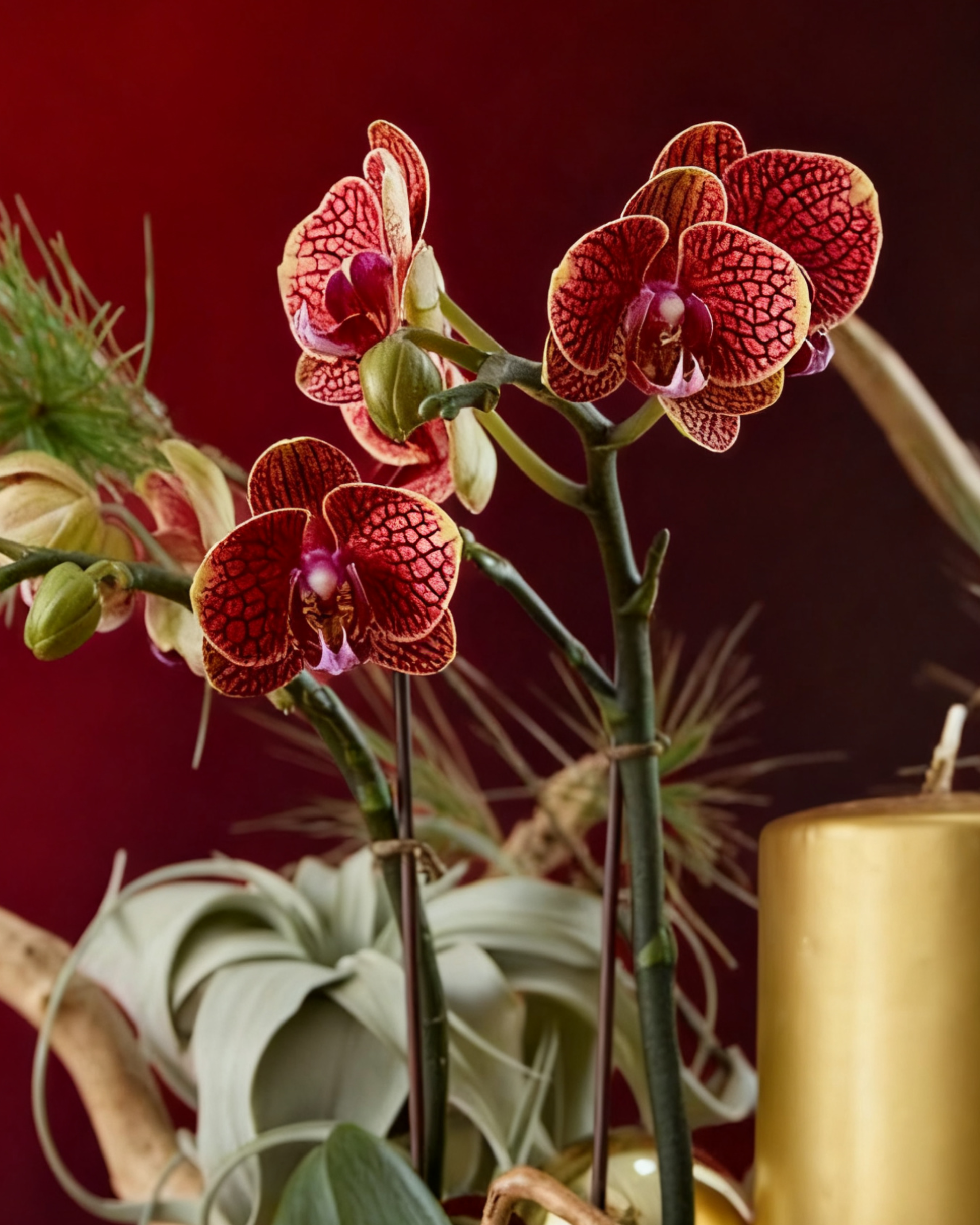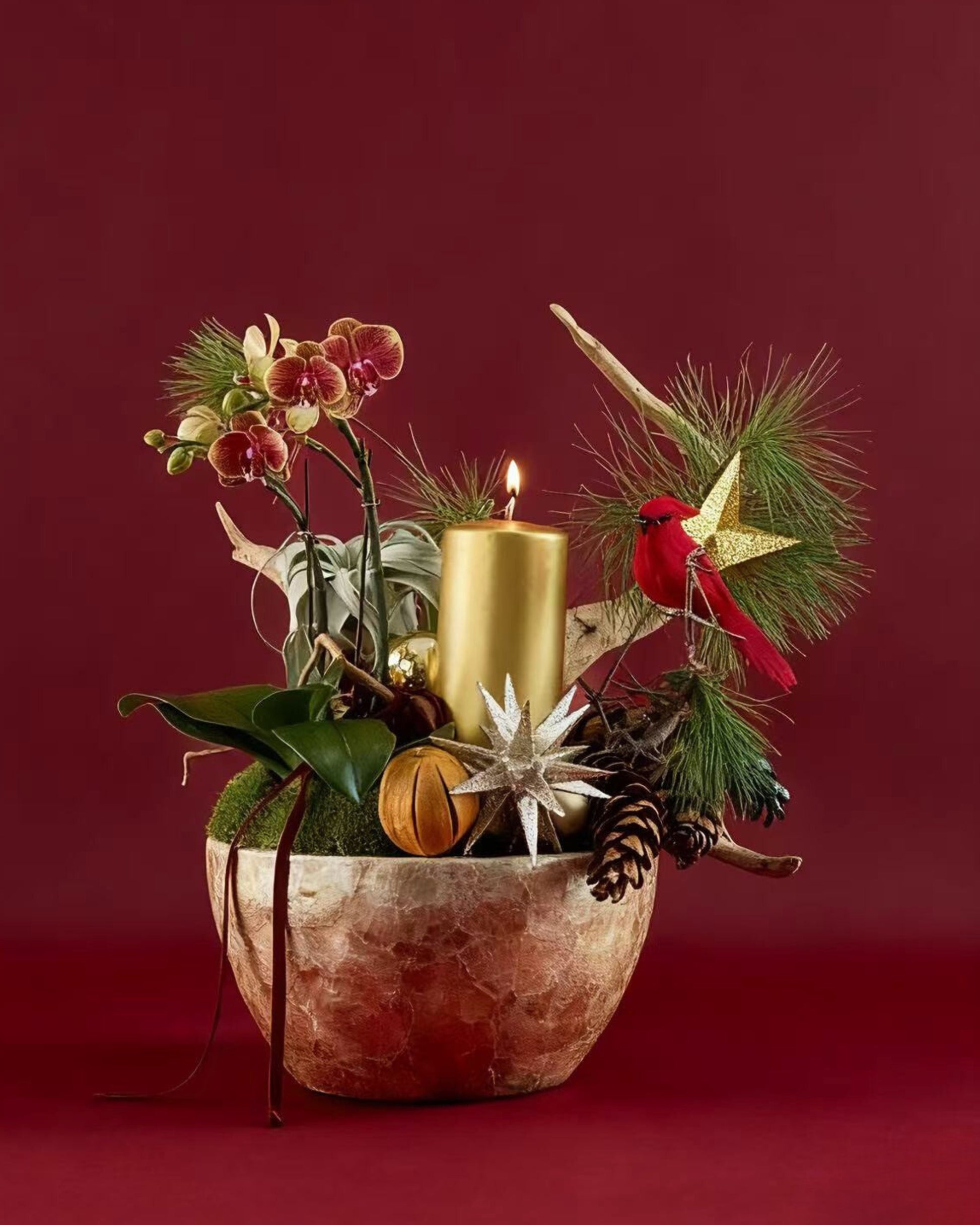 Floral Arrangement includes: Orchid Arrangement with Air Plant, Candle & Assorted Christmas Ornament in Golden Pot
