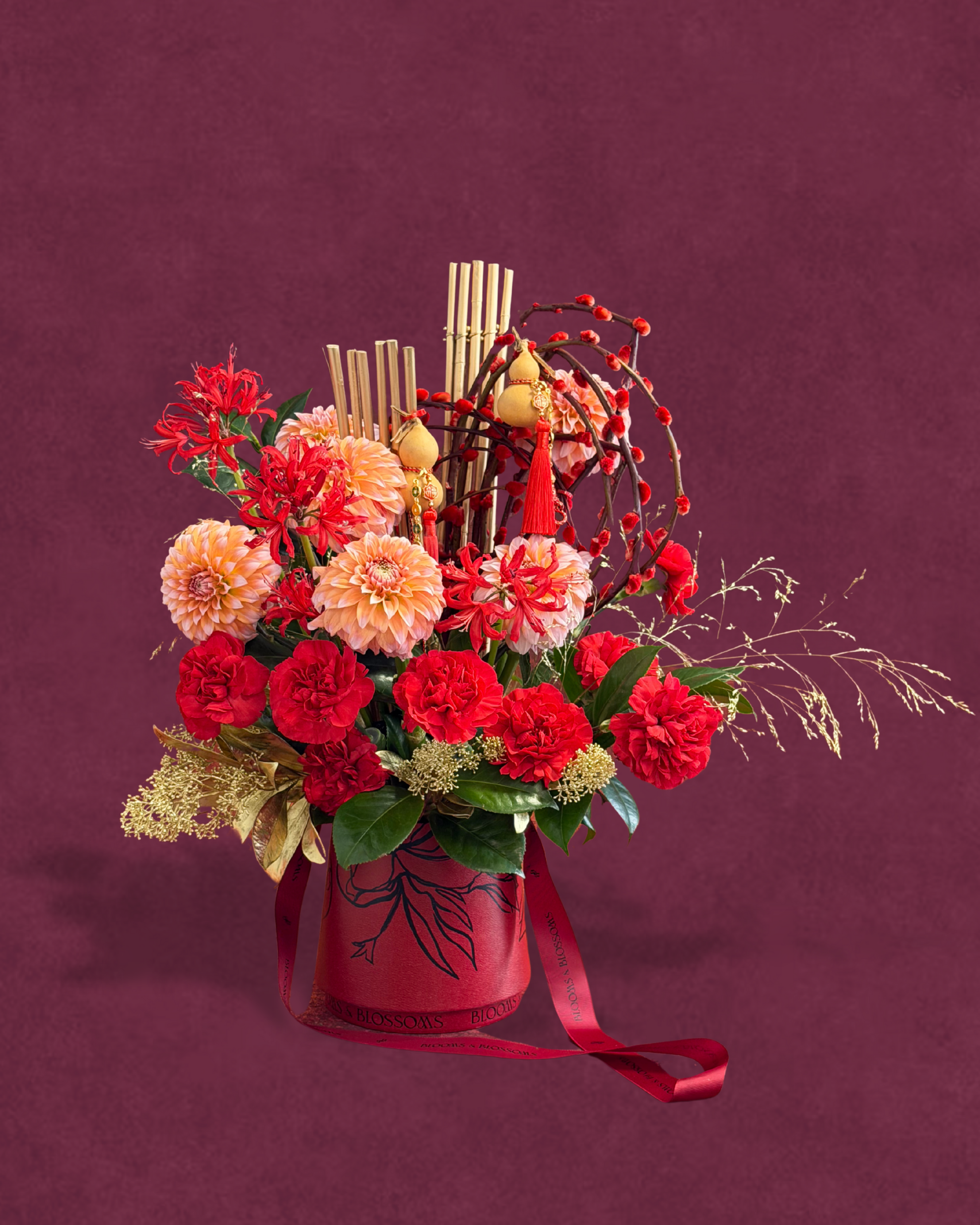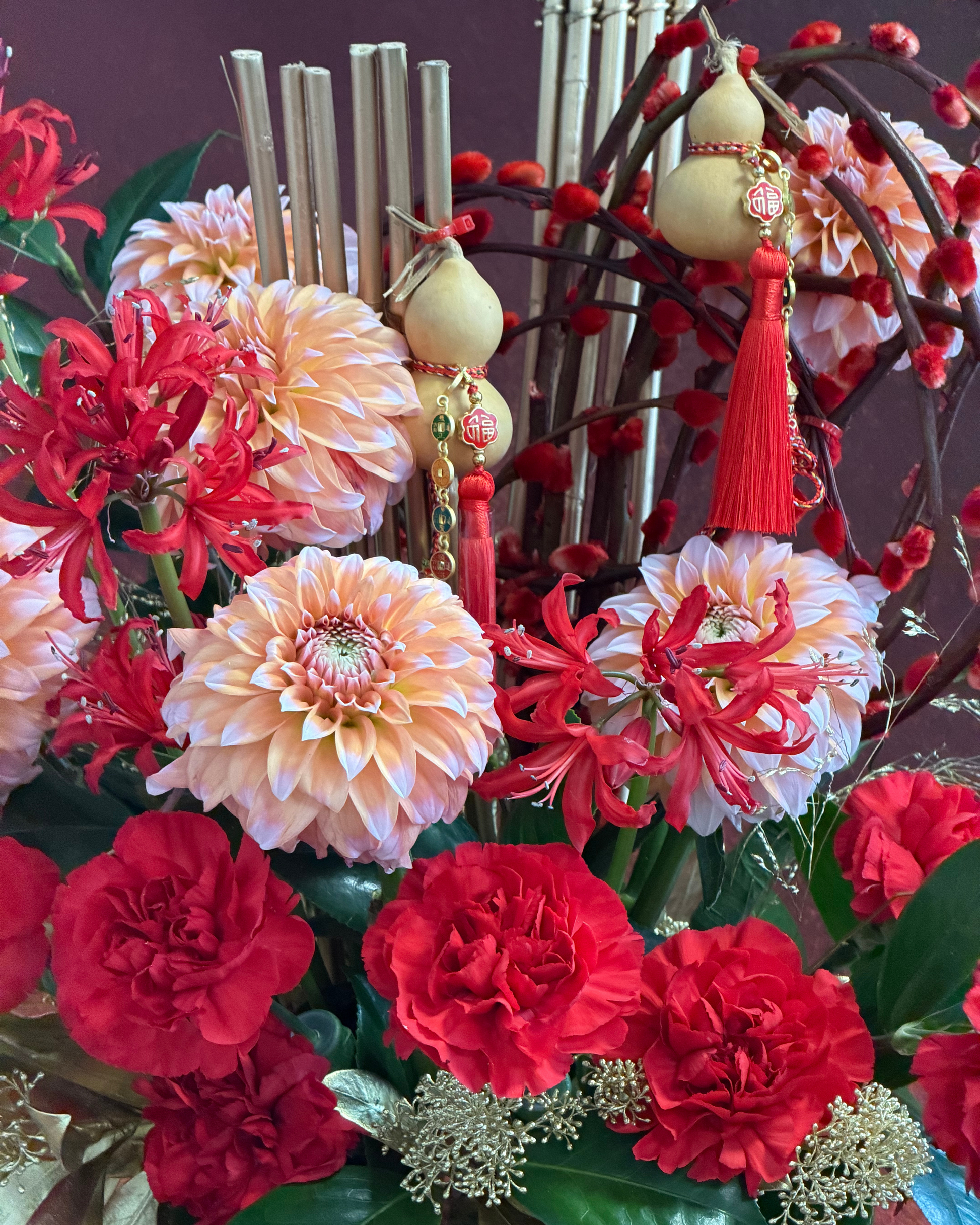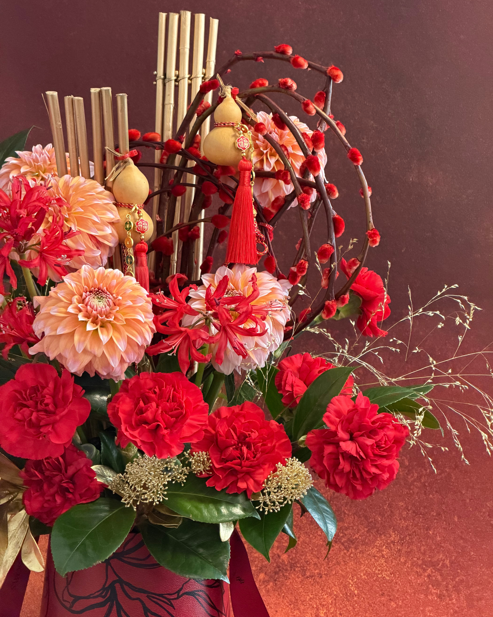 Floral Arrangement includes: Dahlia, Nerine, Pissy Willow, Bamboo, Carnation & Greenery.