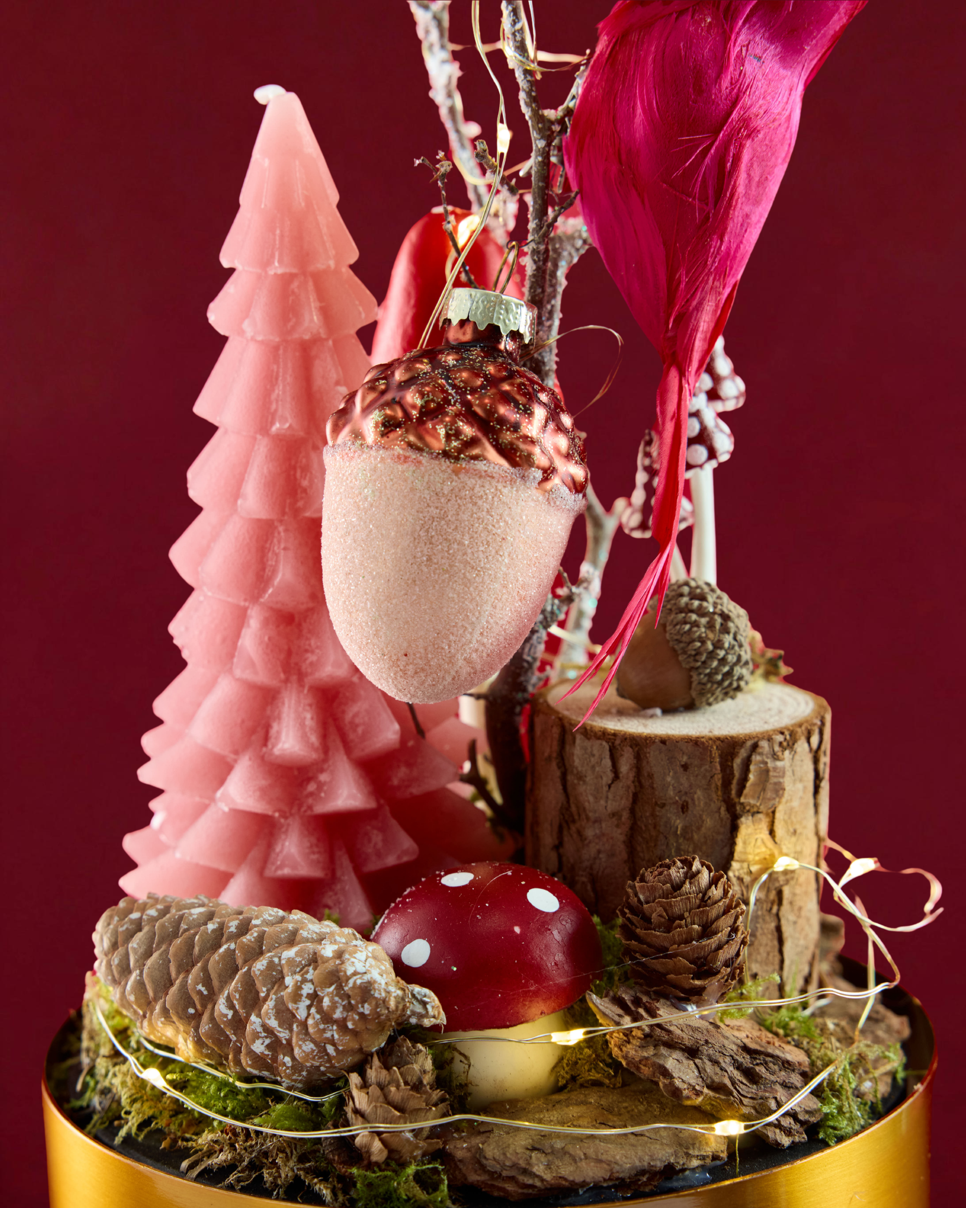 Candle Arrangement includes: Tree Shape Candle, Birds on Bonsai Twigs & Christmas Ornament in a Dome Glass Container