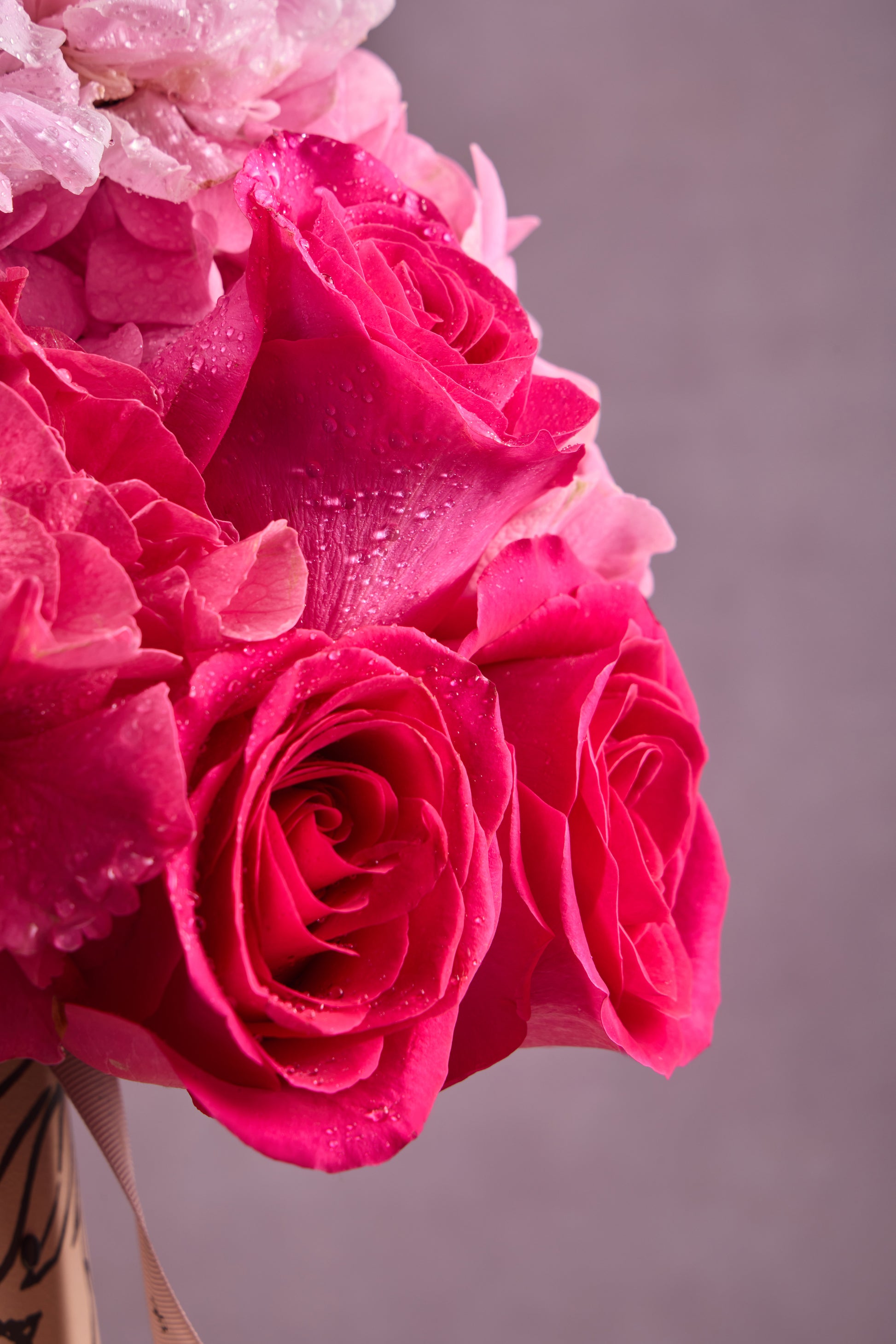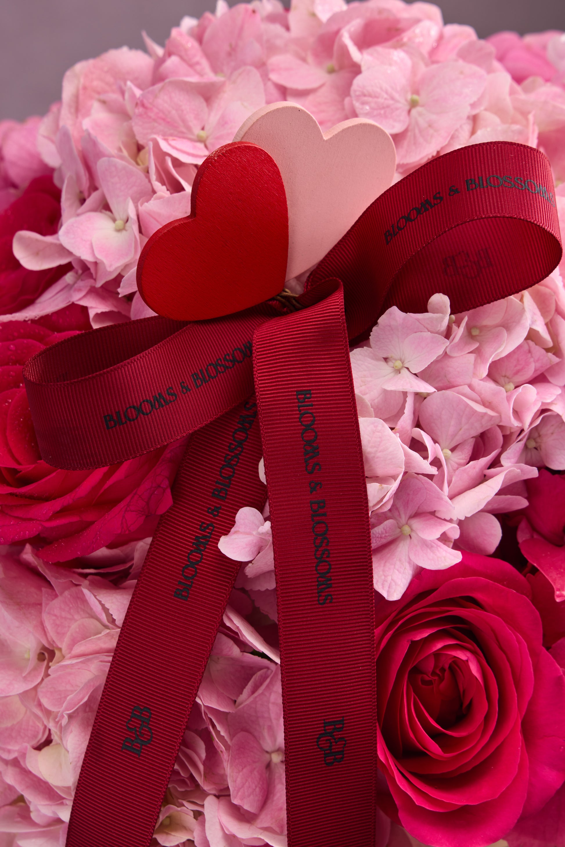 Floral Arrangement includes: BLOOMS & BLOSSOMS Bloom Bucket filled with Fresh Roses, Peonies & Hydrangea in Pink & Fuchsia Tone Décor with Long Red Ribbon & Heart Shape Sticks.