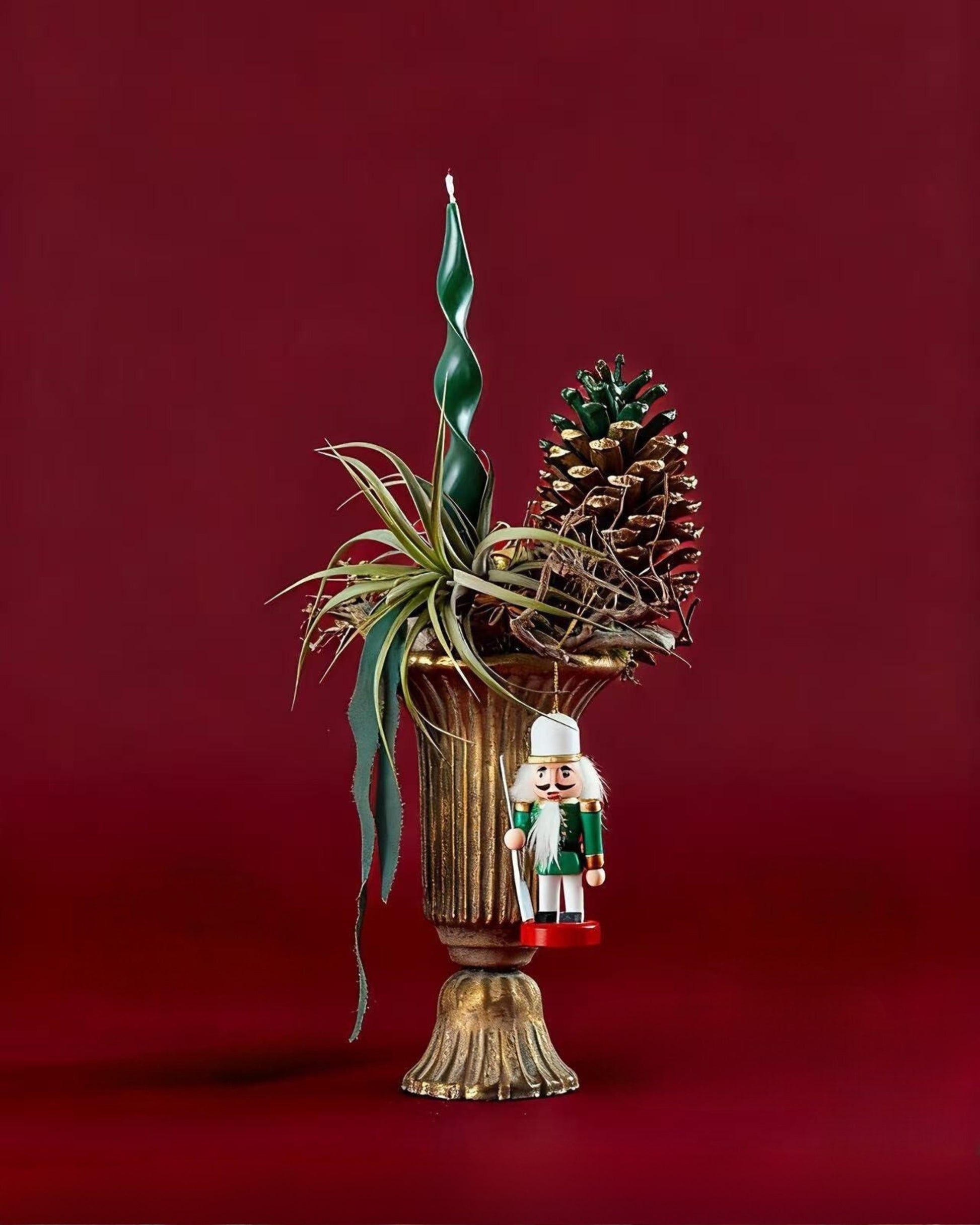 Floral Arrangement includes: Air Plant, Pinecone, Candle and Nutcracker in a Metal Container.