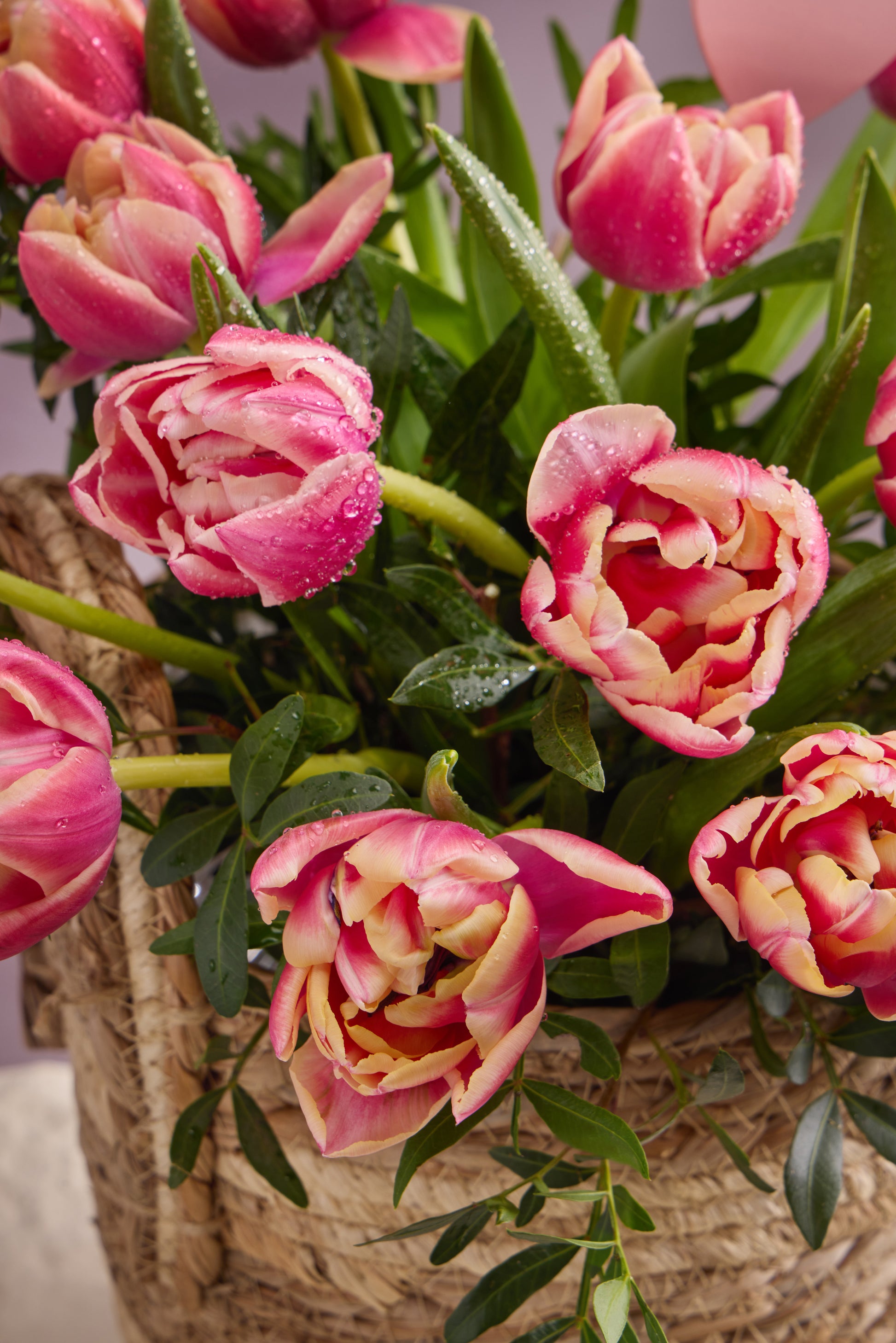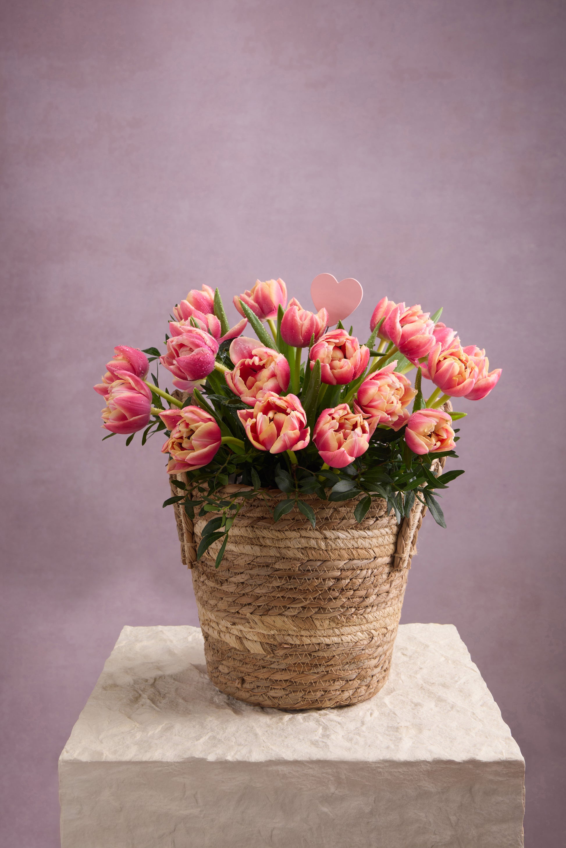 Flower Arrangement includes: Fresh Double Petal Tulips & Greenery in Basket Décor with Heart Shape Stick.