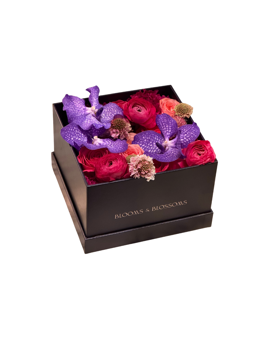 Flower Arrangement includes: Gift Box Filled with Fresh Ranunculus, Freesias, Vandas, Carnations, Spray Roses & Scabiosas.