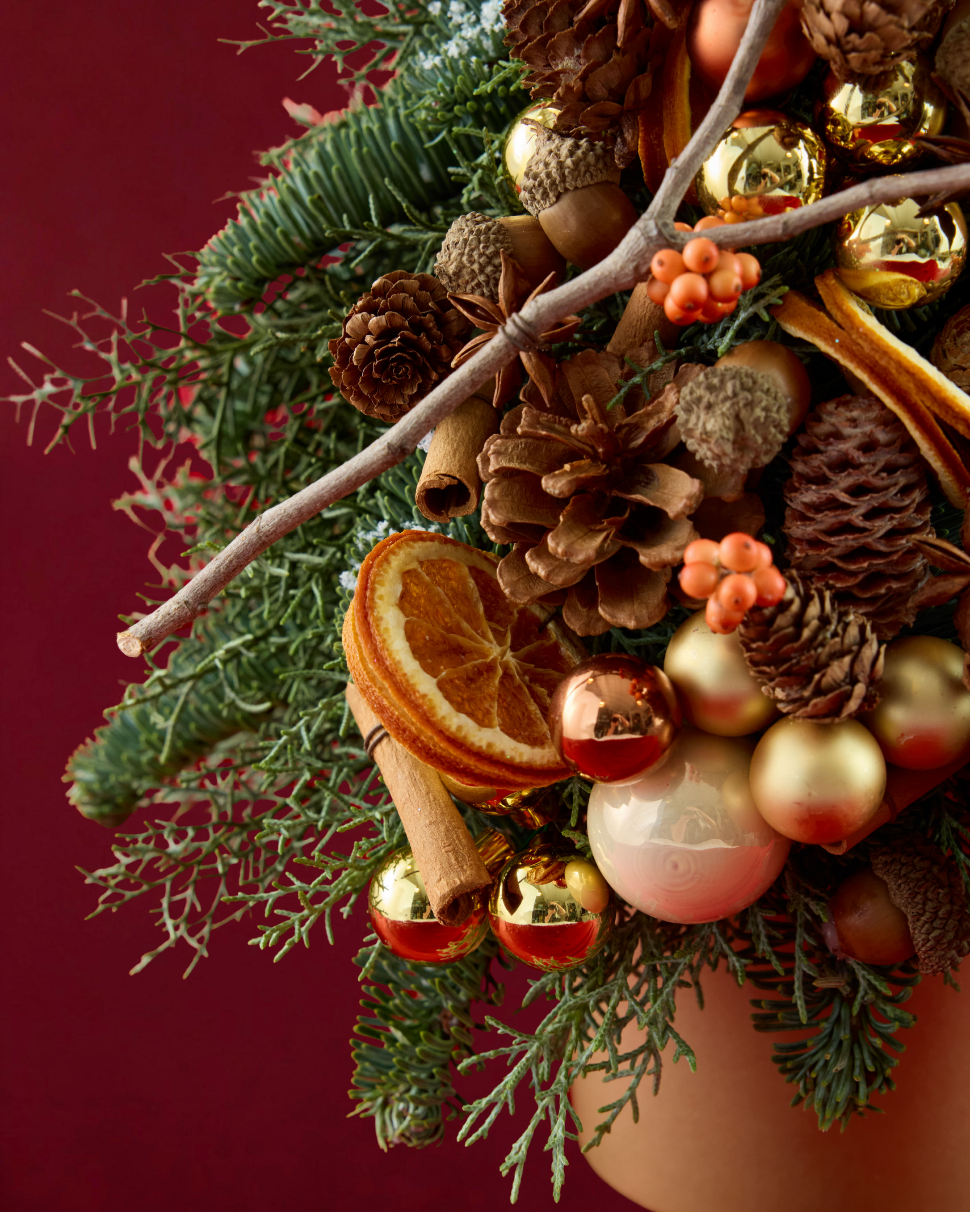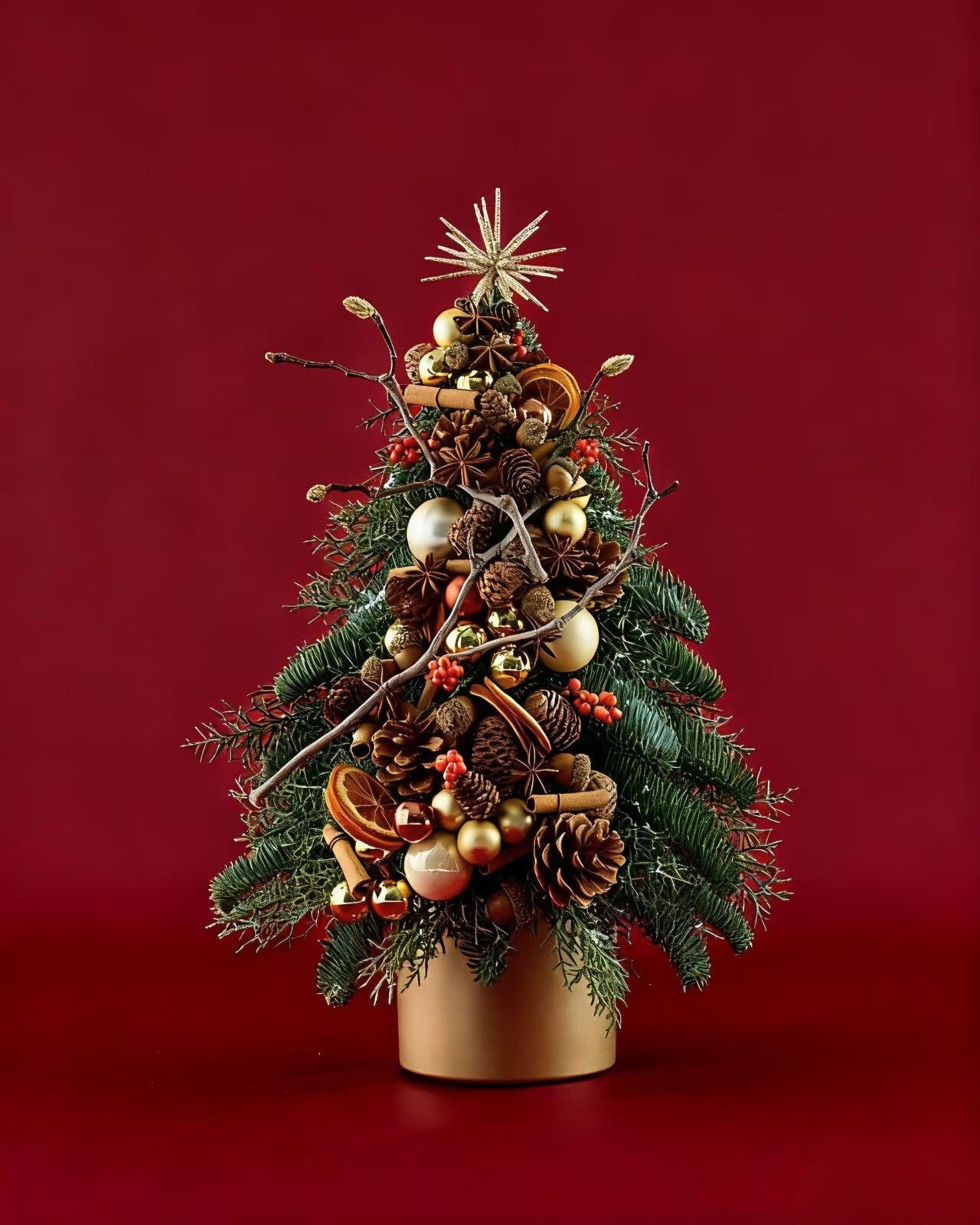 Mini Christmas Tree includes: Magnolia Twigs, Dried Orange Slice, Pinecone, Cinnamon, Gumnuts, Glass Baubles, Velvet Ribbon and Topper Golden Star in Golden Pot.