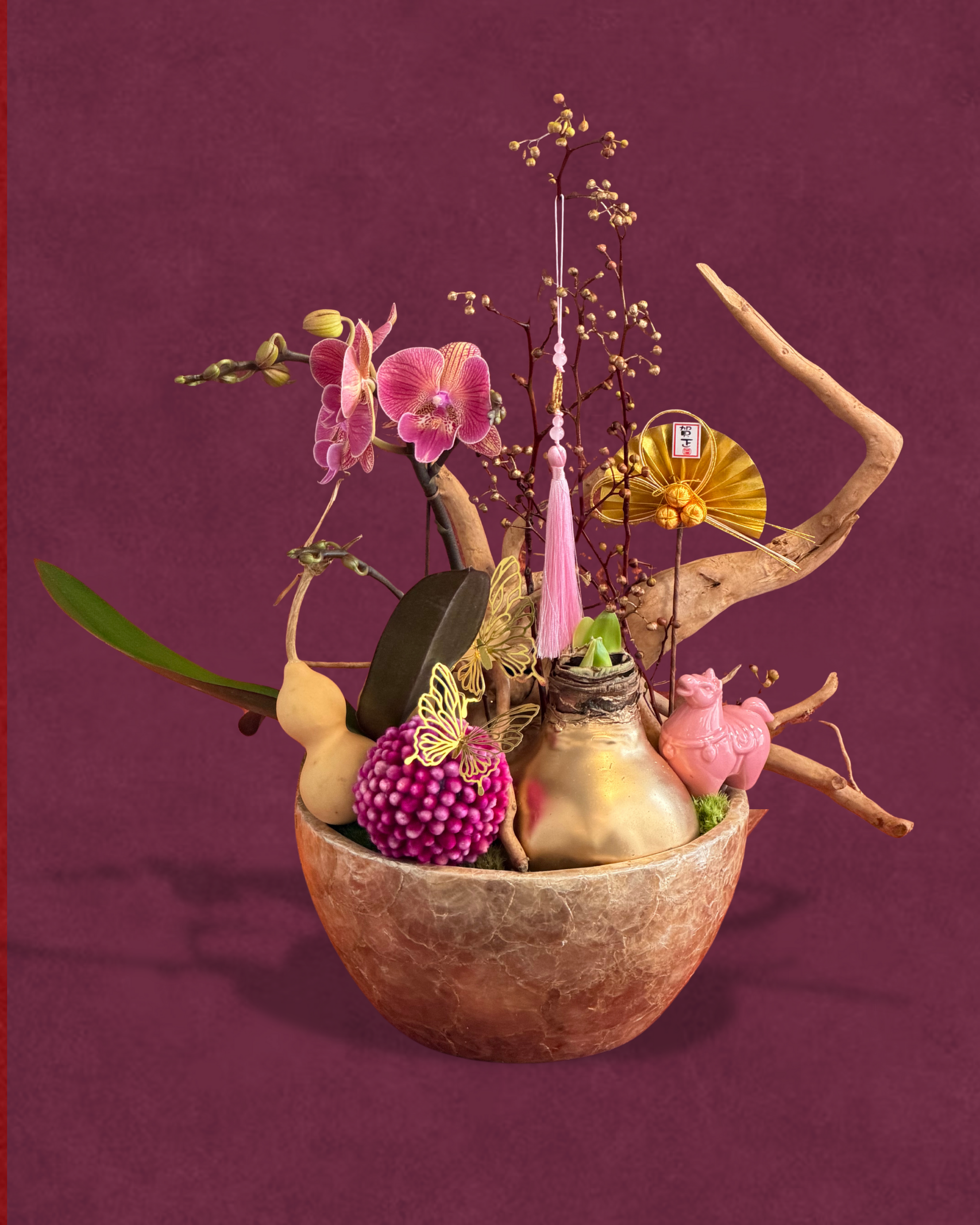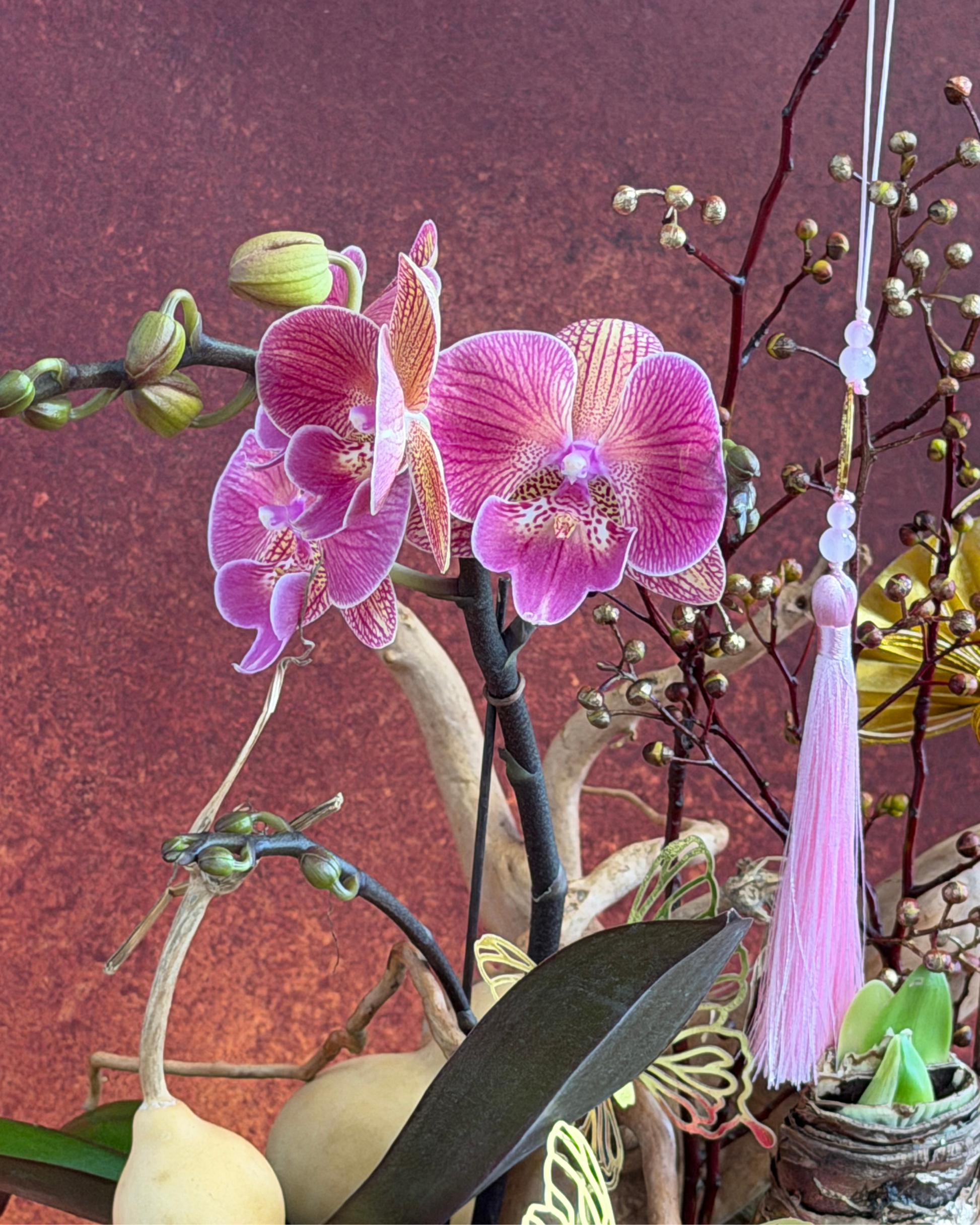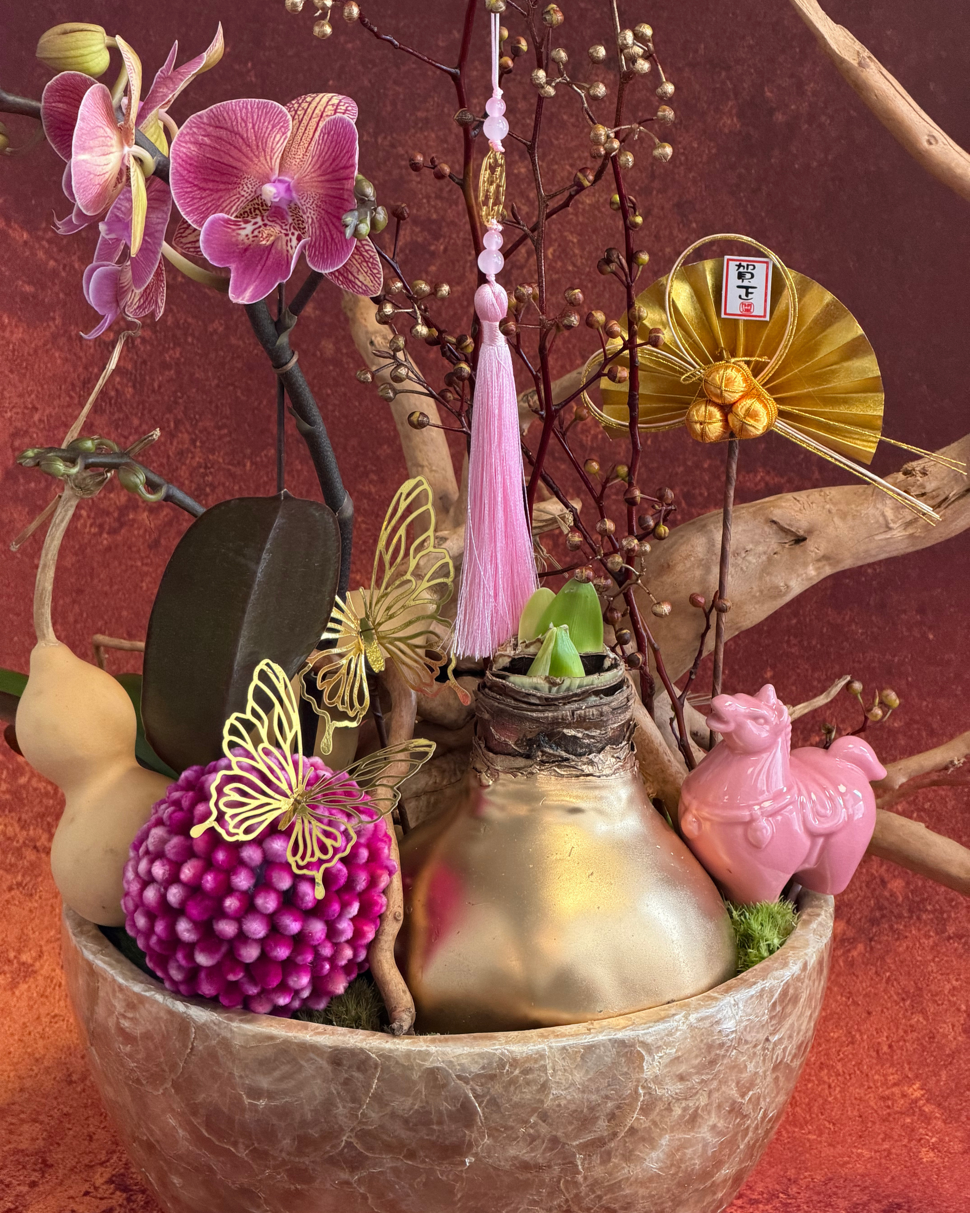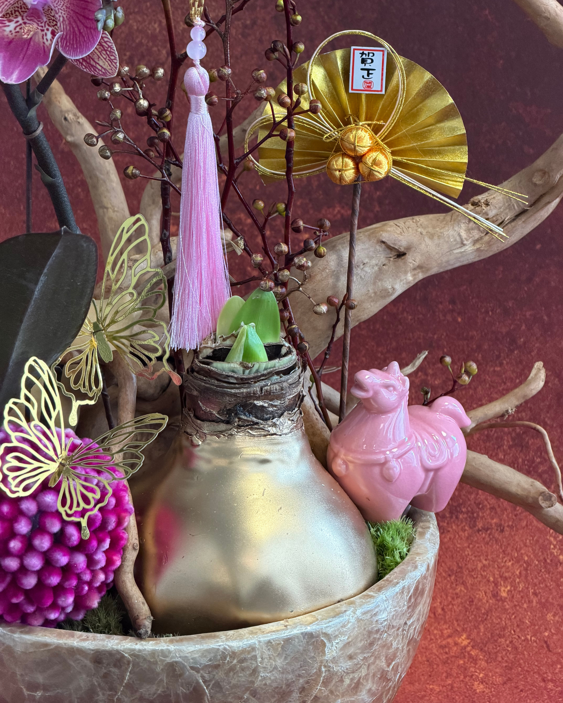 Flower Arrangement includes: Amaryllis Gold Bulb (Pink Flower), Orchid, Horse Ceramic, Tank Toi Twigs.