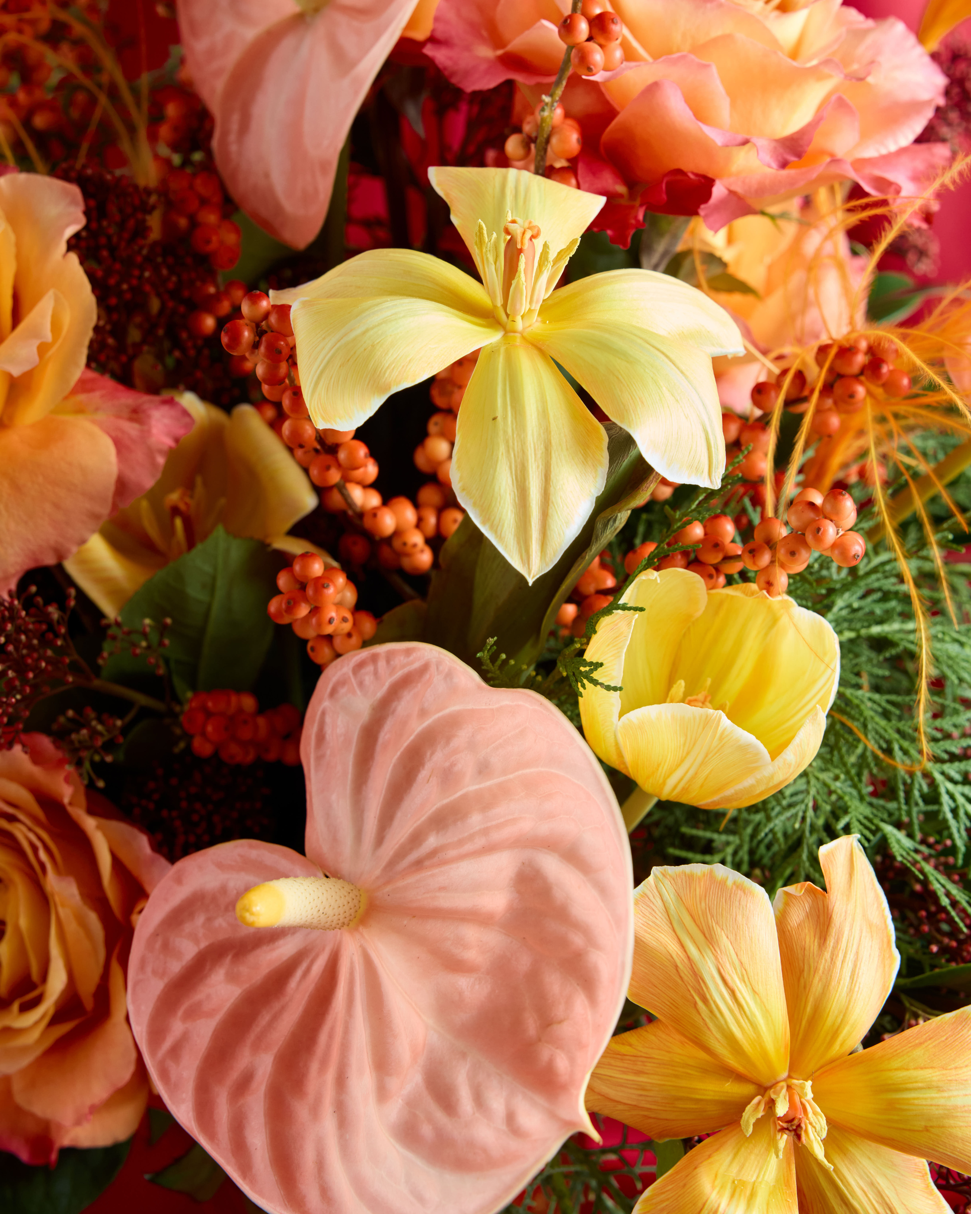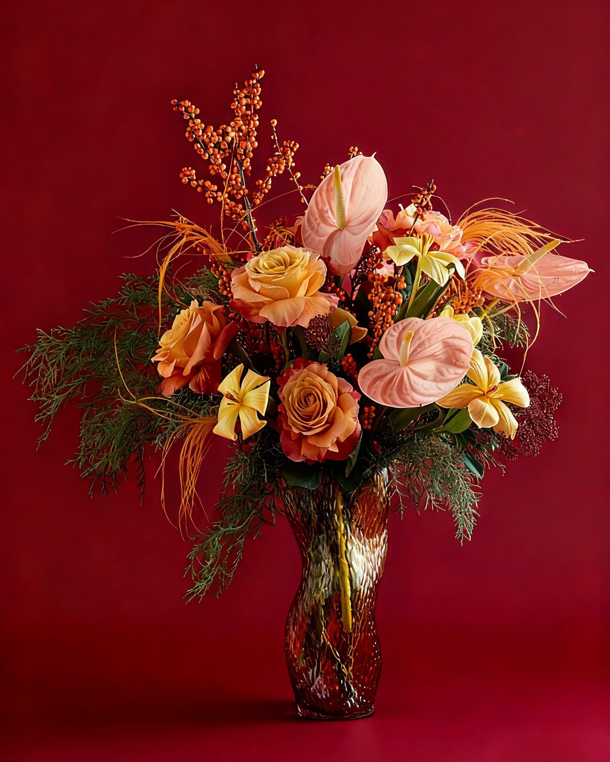 Floral Arrangement includes: Peach Anthurium, Garden Rose, Orange Ilex with Dyed Tulip and Assorted Winter Greenery in Vase.