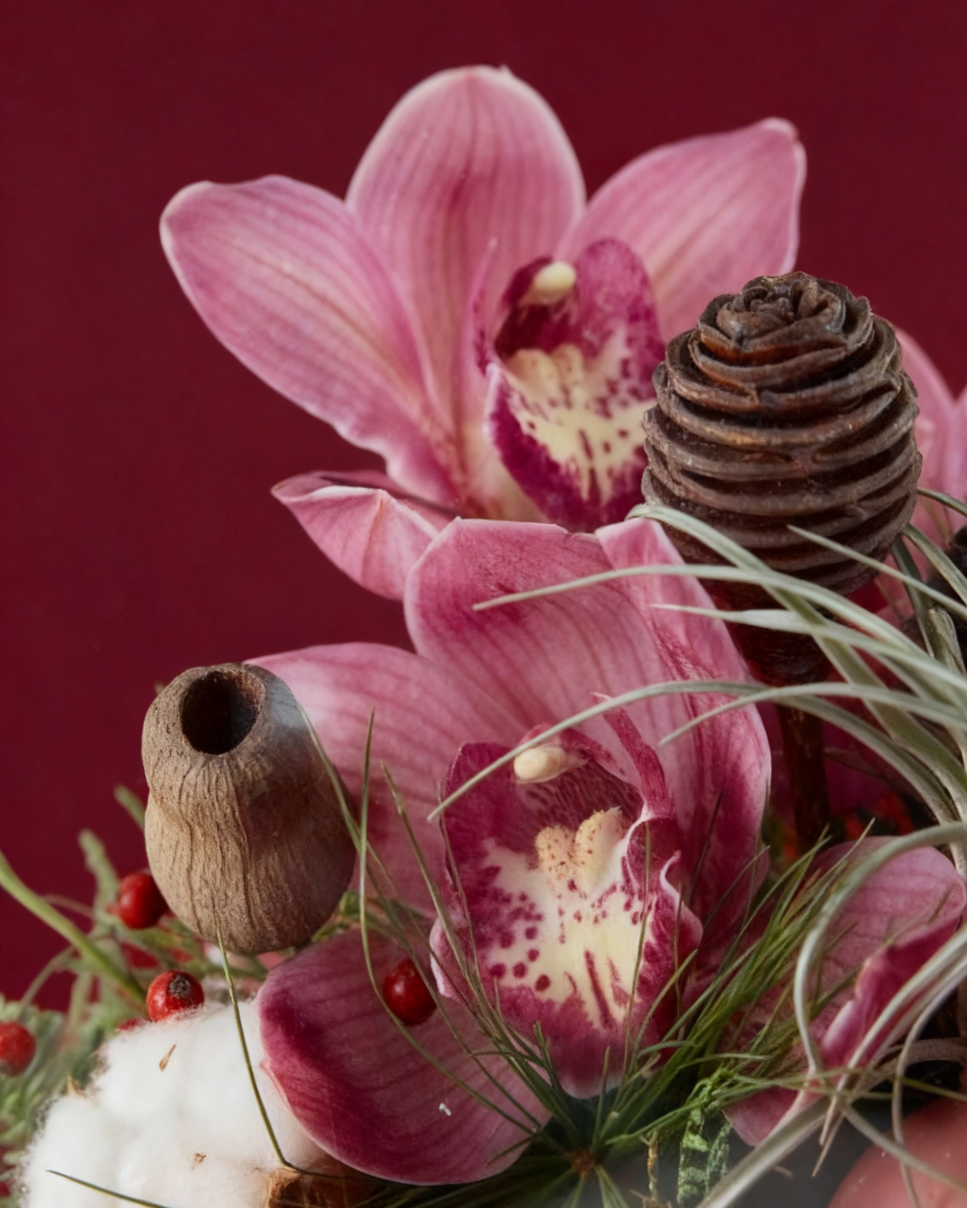The Winter Clutch is a miniature landscape of festive charm artfully arranged within an acrylic handbag. Featuring graceful cymbidium blooms and textural botanicals, this is a living accessory that holds more than just beauty - it carries the promise of holiday magic.