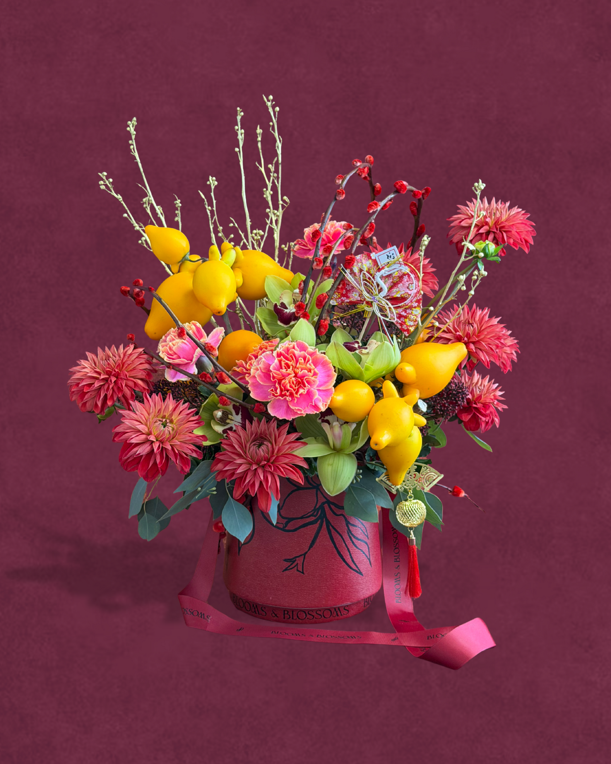 Floral Arrangement includes: Dahlia, Cymbidium, Pussy Willow, Solanum Mammosum, Tank Toi Twigs & Greenery